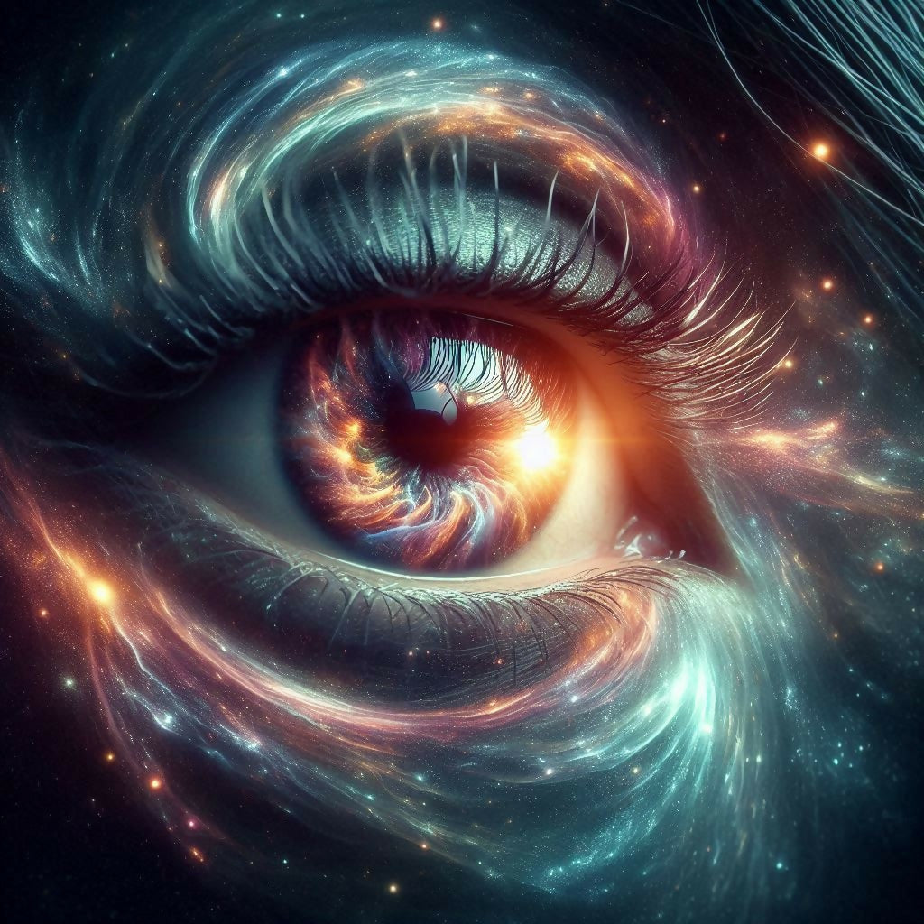 This AI-generated abstract masterpiece fuses the intricate detail of a human eye with the vast beauty of a swirling galaxy. Nebulae spiral through the iris, stardust traces the lashes, and cosmic light radiates from the pupil — creating a breathtaking illusion of the universe reflected in a single gaze. A surreal and awe-inspiring visual that blurs the boundary between humanity and the cosmos.
