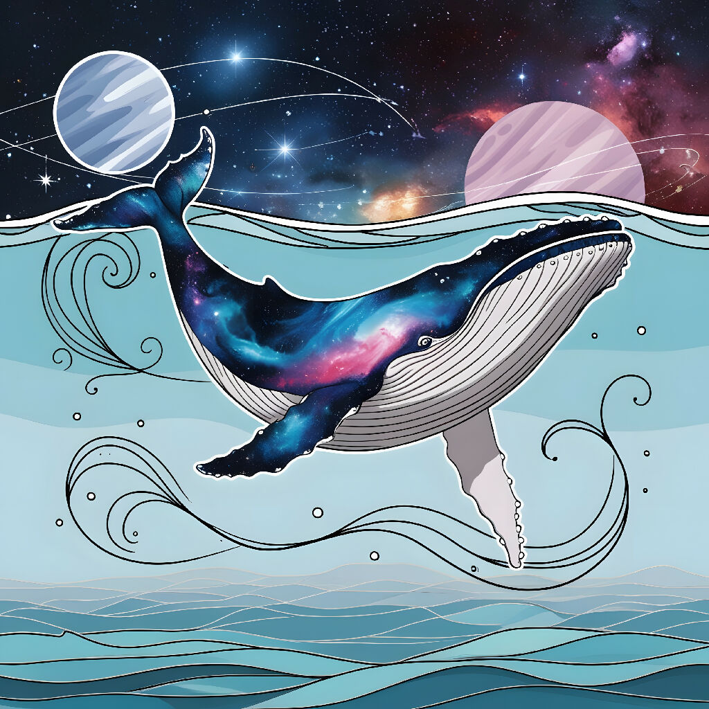 This abstract art piece features a majestic whale swimming through a cosmic ocean, its body adorned with swirling, fluid lines and a galaxy pattern on its skin. The background is a mesmerizing display of stars, nebulae, and distant planets, creating a celestial and otherworldly atmosphere. The combination of the whale's graceful movement and the cosmic elements evokes a sense of wonder and mystery, making this artwork a striking blend of nature and the universe.