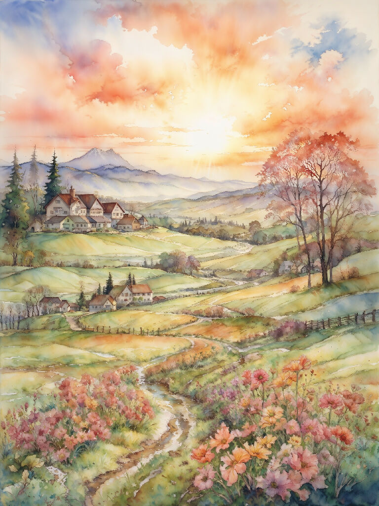 A peaceful landscape painting depicting a tranquil scene, inviting the viewer to escape into a world of wonder.