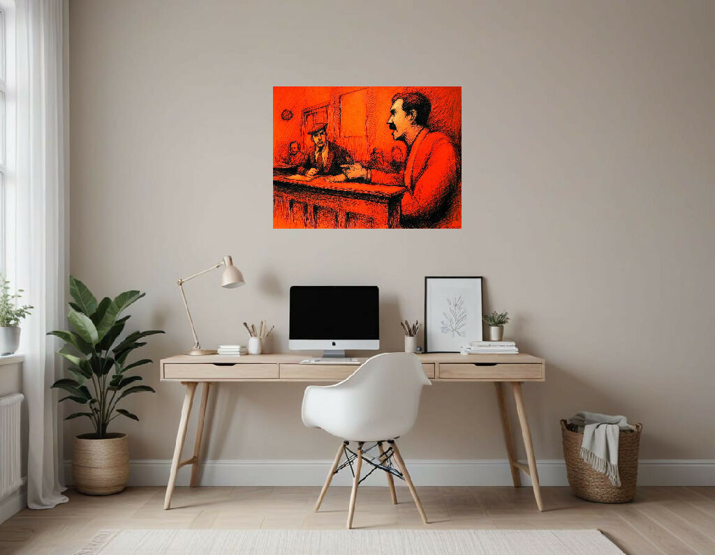 On the left, a man wearing a newsboy cap sits at a desk, observing the speaker with a stern expression. The desk is adorned with documents, suggesting he is actively engaged in the proceedings. Behind him, additional figures are seated, their faces partially obscured but seemingly attentive.