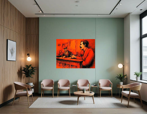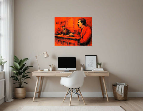 The painting presents a dramatic, fiery courtroom scene rendered in vivid red and orange hues, accentuated by intricate black linework. The composition is dominated by a speaker on the right side, with a prominent mustache, his mouth open as if delivering a powerful statement. His right hand extends forward, pointing emphatically.
