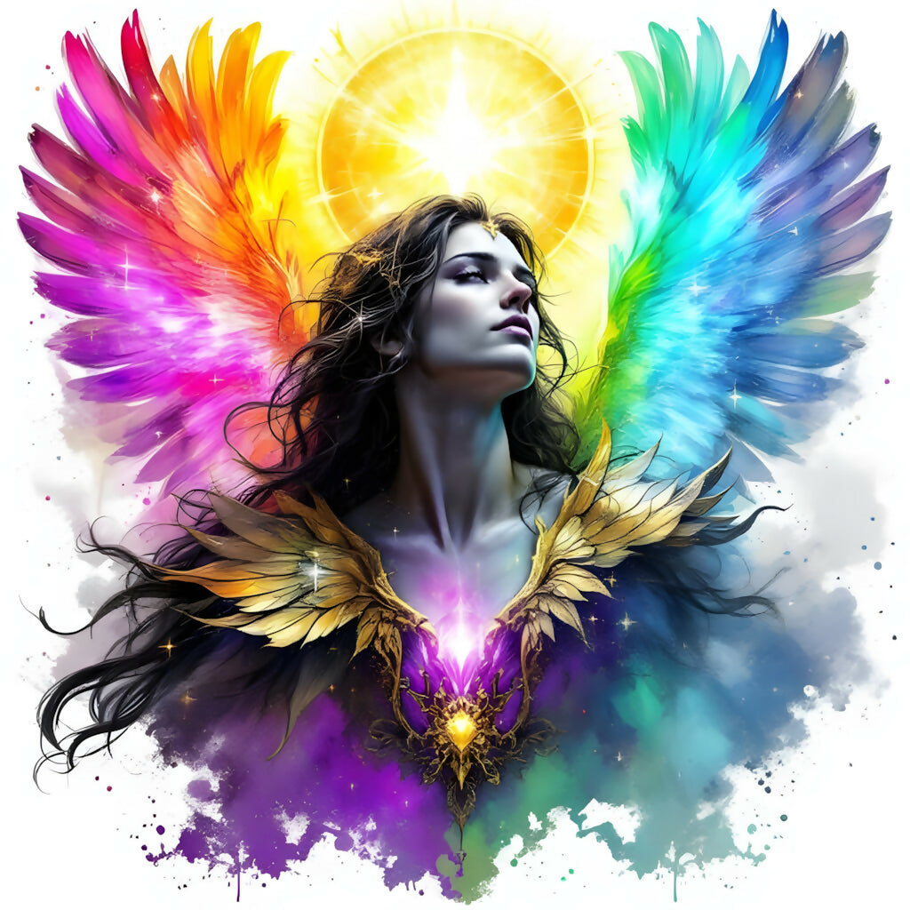 This majestic male archangel blazes with power, radiance, and divine fire. A golden sun halo crowns him as his multicolored wings stretch wide—each feather pulsing with cosmic light. His armor gleams with celestial gold, and a radiant jewel of energy emanates from his chest like a divine heart.