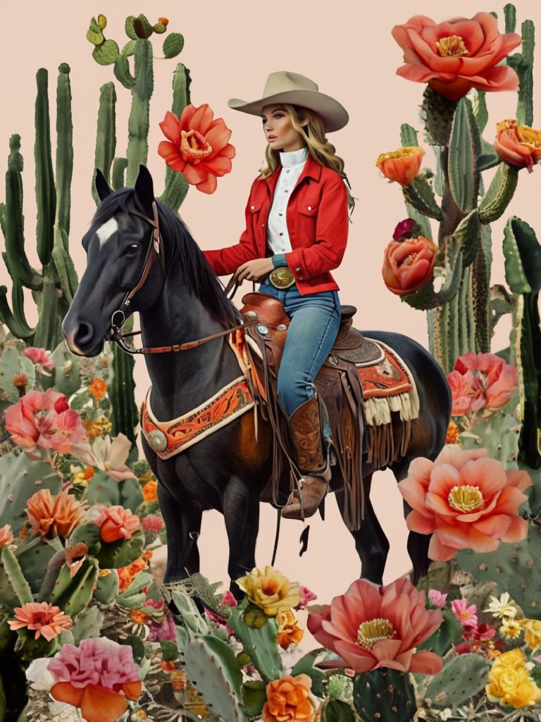 Gallop into style with this stunning cowgirl on horse digital art print, a vibrant western illustration that brings the spirit of the wild west to your home. This high-quality digital download features a strong, stylish cowgirl atop her majestic horse, surrounded by lush desert flora, including colorful cacti and blooming desert flowers. Rendered with a touch of vintage western aesthetic and modern digital art flair, it's perfect for southwestern home decor, farmhouse style, or any space that celebrates equestrian charm.