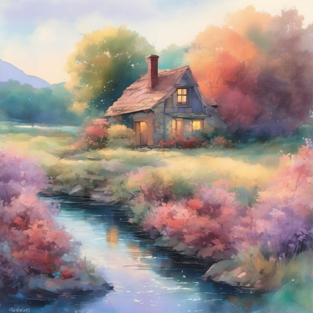 "A charming watercolor painting of a cozy cottage with a thatched roof, nestled in a landscape bursting with color. The cottage walls are painted in soft, earthy tones, with hints of warm ochre and gentle browns, while the roof is depicted with delicate strokes of golden straw. Wisps of smoke rise from the brick chimney, blending softly into the sky.