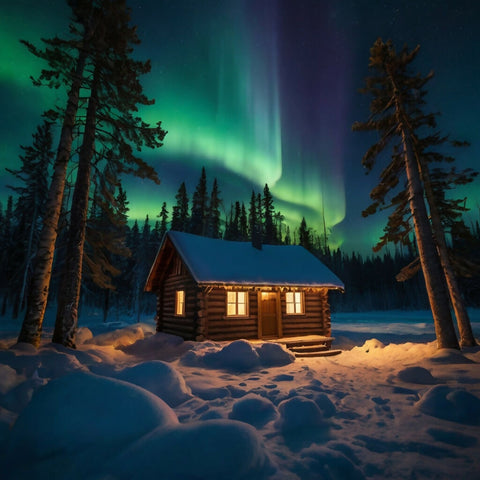 "A cozy wooden cabin in a snowy forest at night, warm lights glowing from windows, smoke from chimney, aurora borealis in the sky, peaceful atmosphere, ultra-realistic 8K"