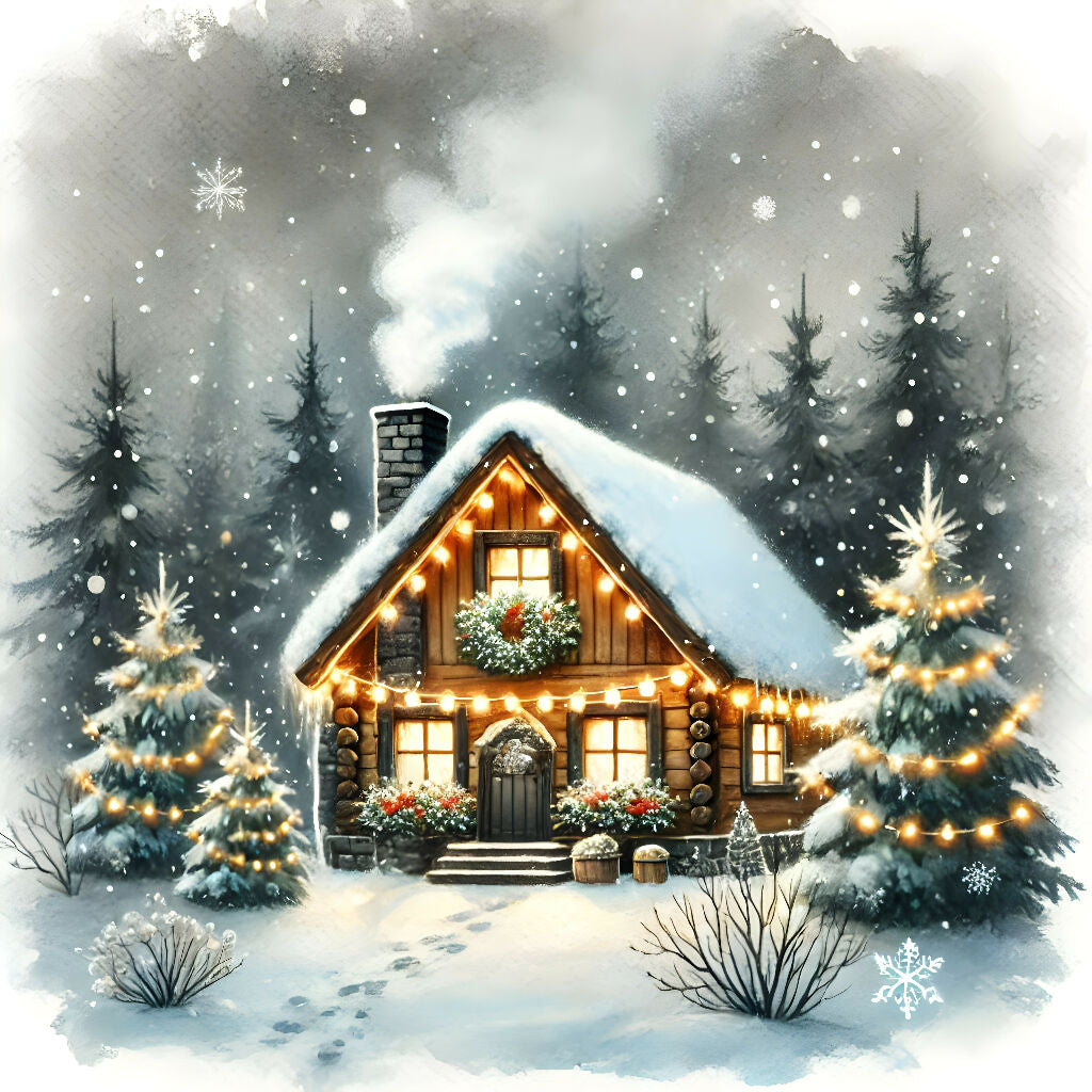 Immerse yourself in the magic of winter with this enchanting digital art print. Featuring a cozy wooden cabin adorned with glowing fairy lights, surrounded by snow-covered pine trees, this artwork captures the serene beauty of a snowy night. The warm, inviting atmosphere, coupled with delicate snowflakes falling gently, makes it a perfect piece for holiday decor, Christmas celebrations, or winter-themed collections. Ideal for adding a touch of warmth and charm to any space.