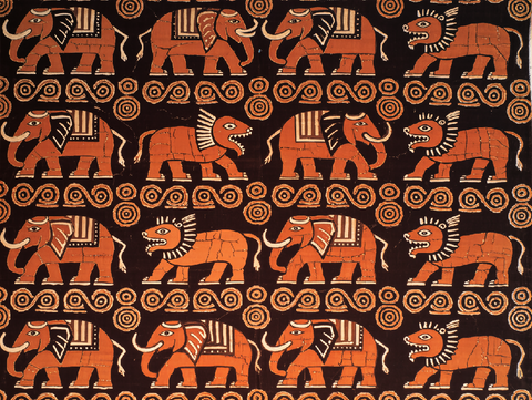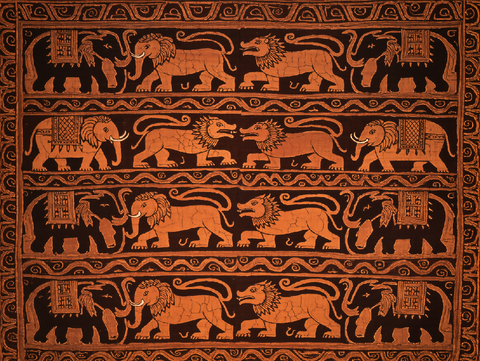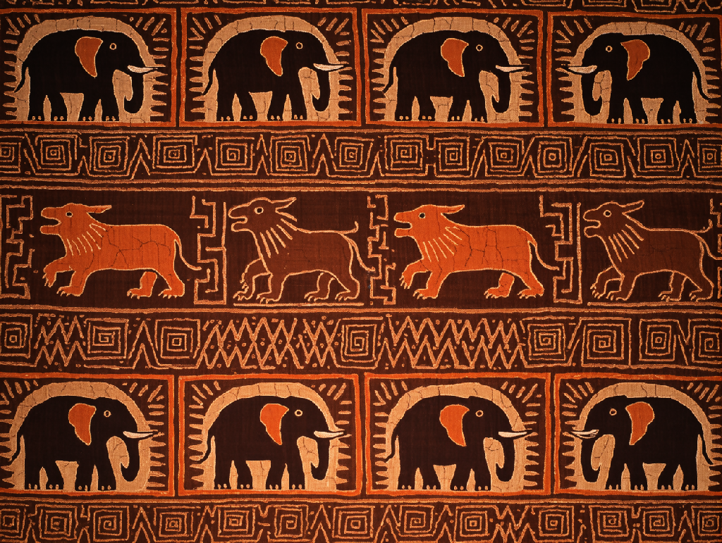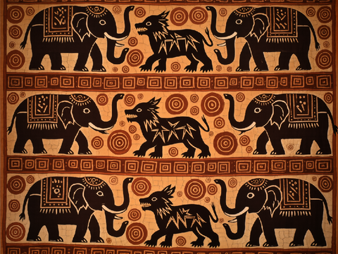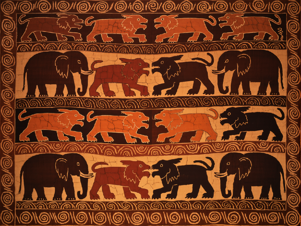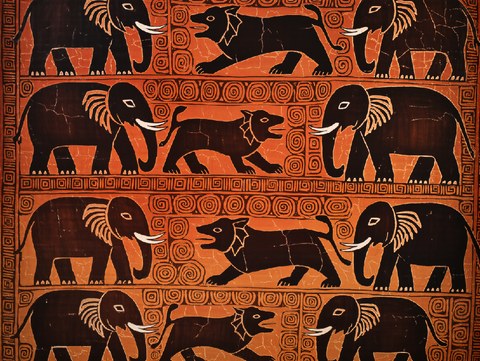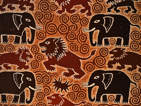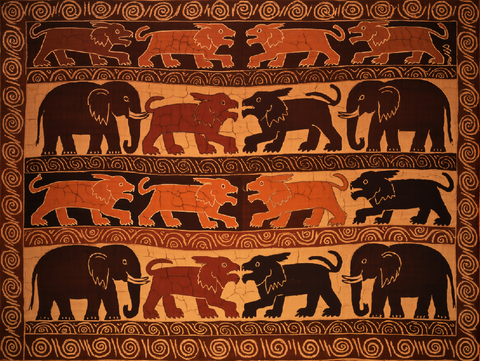 Tribal-style elephants and lions emerge from rhythmic spirals in dark batik tones, textured with natural crackle lines for raw, handmade beauty.