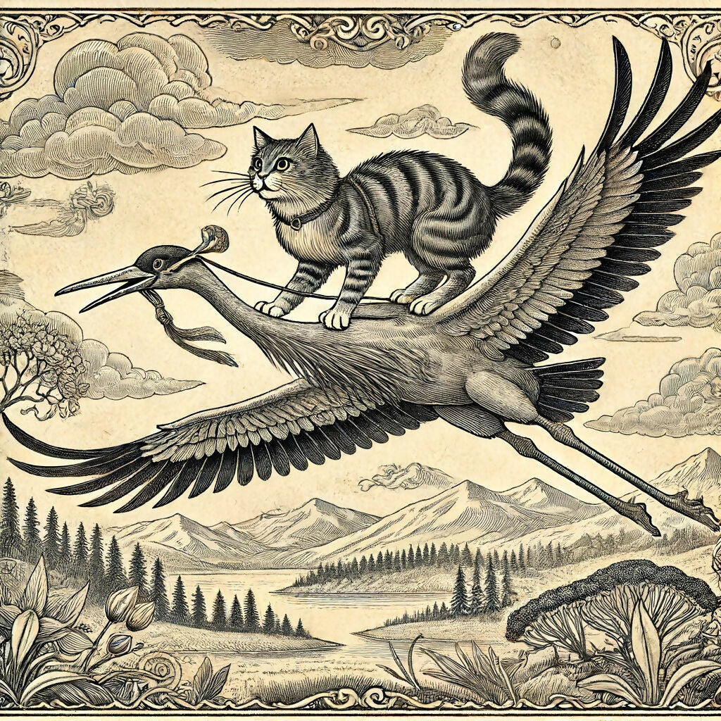 In a traditional style drawing, a graceful crane soars through the skies, carrying a serene cat on its back. Below them stretches an enchanted landscape filled with lush forests, sparkling rivers, and mystical flora. The intricate details and delicate lines capture the magic and tranquility of this fantastical journey, evoking a sense of wonder and adventure.