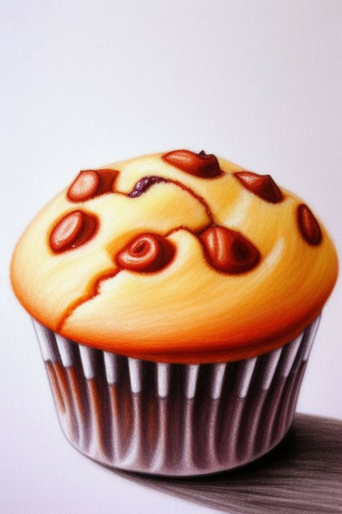 A crayon drawing of a chocolate chip muffin with a white background. The muffin looks delicious to eat as a snack.