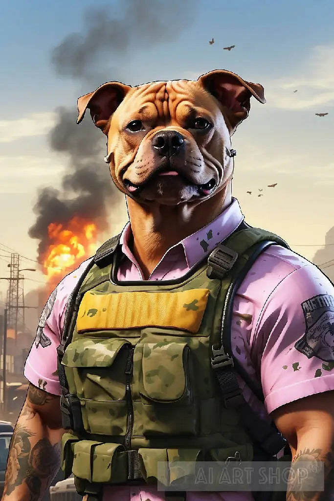 Crea un personaje estilo GTA V que sea hombre de 25 años, un químico, con un traje militar urbano como SOAP de call of duty acompañado de un staffy sonriendo, con rasgos de gánster y de fondo una central nuclear.