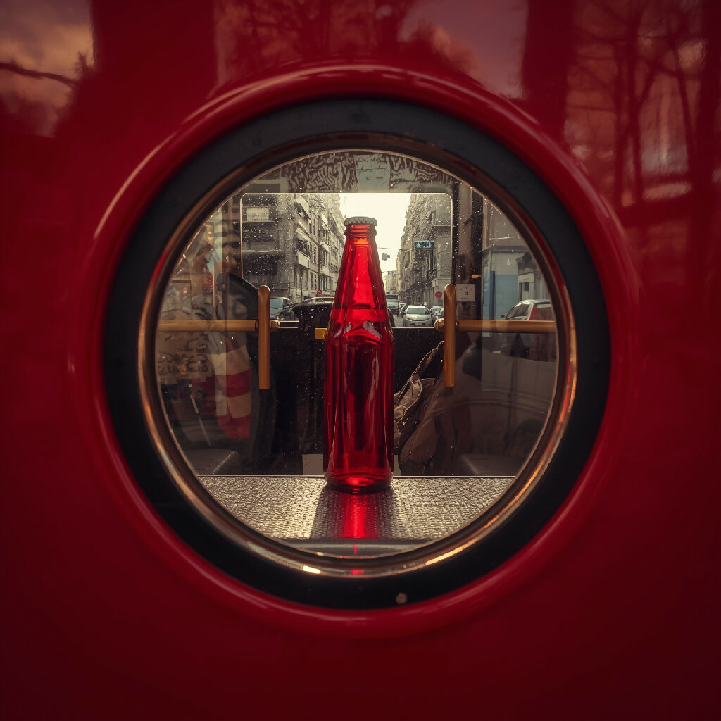 Crea una imagen de un botón rojo brillante con un diámetro aproximado de 8cm ubicado en una baranda metálica cromada dentro de un bus urbano en Lima