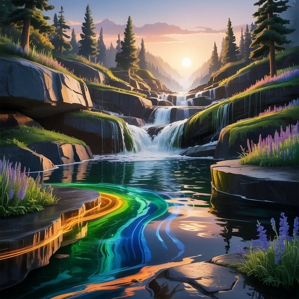 Create a crystal-clear, ultra-high-resolution digital illustration of a majestic alpine waterfall at dawn 2