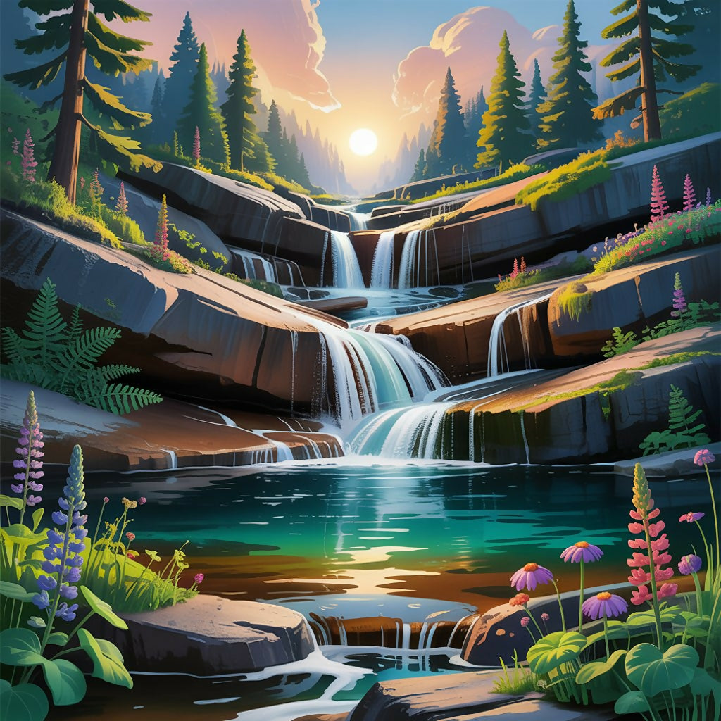 Create a crystal-clear, ultra-high-resolution digital illustration of a majestic alpine waterfall at dawn 3