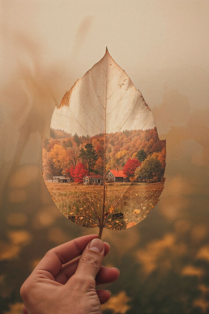 "Create a high-resolution artistic image of a single, softly textured watercolor leaf as the main canvas. The outer edges of the leaf should appear hand-painted, blending organically into the background with delicate brushstroke textures. In the center of the leaf, illustrate a breathtaking autumn landscape—featuring vibrant fall trees in shades of amber, crimson, and gold. Include small rustic houses with red rooftops nestled among the trees, set against a gently rolling field of wildflowers. Use warm lighting and a dreamy, poetic atmosphere to evoke nostalgia and tranquility. The result should feel like nature and art merging into a delicate, emotional masterpiece