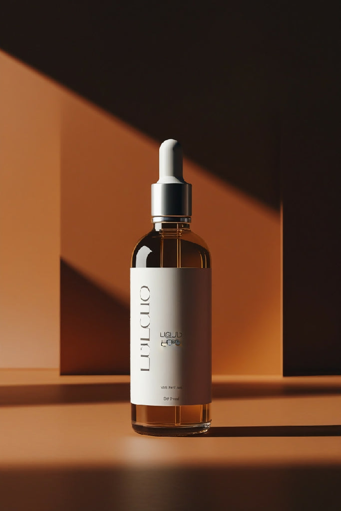 Create a minimalist sleek advertisement featuring a liquid herb bottle prominently displayed in the center, set against a rich dark orange background that dominates the scene, with the bottle itself boasting a slender glass form, a refined label in a simple sans-serif font, and a silver cap that adds a touch of modernity, all captured in a high-contrast lighting setup that accentuates the elegance and simplicity of the overall design, emphasizing clean lines, ample negative space, and a sense of sophistication.