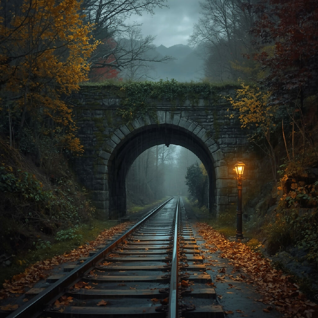 Create a moody autumn painting of a hidden railway track leading into an old stone tunnel, its arch draped with ivy and moss. The evening rain falls gently, coating the ground in a glossy sheen. A dim lantern glows on a post, its light blurred by the mist. The forest surrounding the tunnel is alive with golden and crimson leaves, while far above, the dark outline of mountains looms silently. The whole scene feels like the beginning of a long-forgotten story.