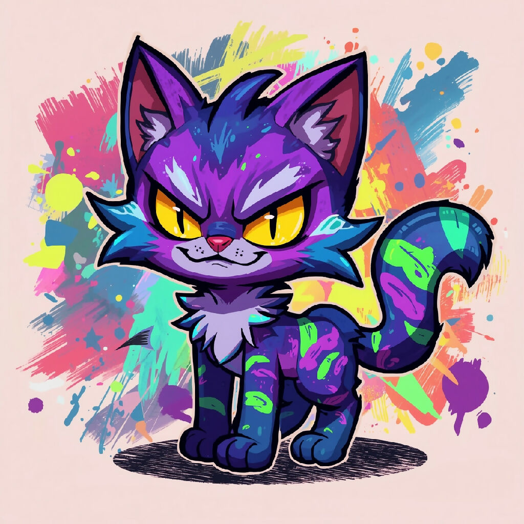 Create a vibrant chaos cat character with a mischievous personality, featuring a mixture of swirling purple and blue fur with neon green stripes, bright yellow eyes, and a fluffy tail, set against a dynamic background of abstract shapes and colors, with bold black outlines and textured brushstrokes, and incorporate subtle gradient effects to give the character a sense of depth and dimensionality, with the cat's facial expression conveying a sense of playful unpredictability and energetic movement.