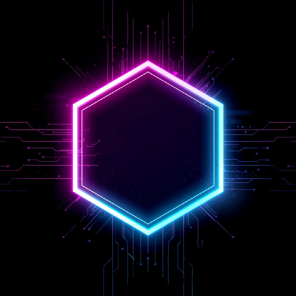 Create a YouTube banner (2028x1152 px) in neon cyberpunk style. Background: deep black with glowing accents. Main colors: neon pink (#ff00cc) and neon cyan (#00e5ff). In the center, place a glowing futuristic hexagon frame with bright neon gradients. Inside the center, add abstract glowing lines, particle effects, and light waves so it is not empty, but stylish and full. Add depth with soft light flares and futuristic circuit elements around. Keep a balance between minimalism and energy: the center must look powerful, not blank.
