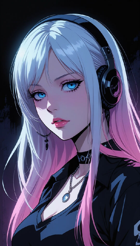 Create an anime style girl of punk rock Music woman Listen twilight,Create an anime style girl of the 80s and 90s. features a female bathed in deep dark light.. blue-purple-black palette intensifies the mood, evoking a sense of mystery and allure. Subtle film grain and meticulous shading add depth and texture, emphasizing the emotional gravity. lighting creates a chiaroscuro effect, accentuating her expressive pose , long white and pink hair and no bob cut hair in , black shirt,blue eye with light,punk rock Music woman Listen twilight,rock affect,