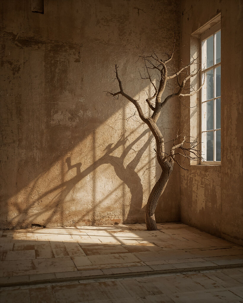 Create an ultra-realistic 3D scene of a dead tree entering through a window on one side of the photo where there is an empty space with an old wall