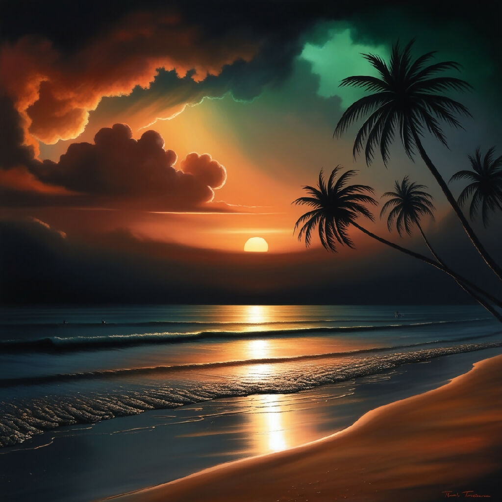 Creates a dramatic dark sunset on a serene beach, with the sky ablaze in warm shades of burnt orange, golden hues, and deep blues, gradually darkening to a mysterious green and finally, a bold black at the horizon, where the silhouette of palm trees stretches towards the heavens, their slender trunks and leafy fronds stark against the vibrant backdrop, as the waves gently lap at the shore, leaving behind a trail of moist, dark sand that glistens in the fading light, with a few scattered beachgoers in the distance, their figures mere silhouettes, adding a sense of tranquility to the enchanting atmosphere.