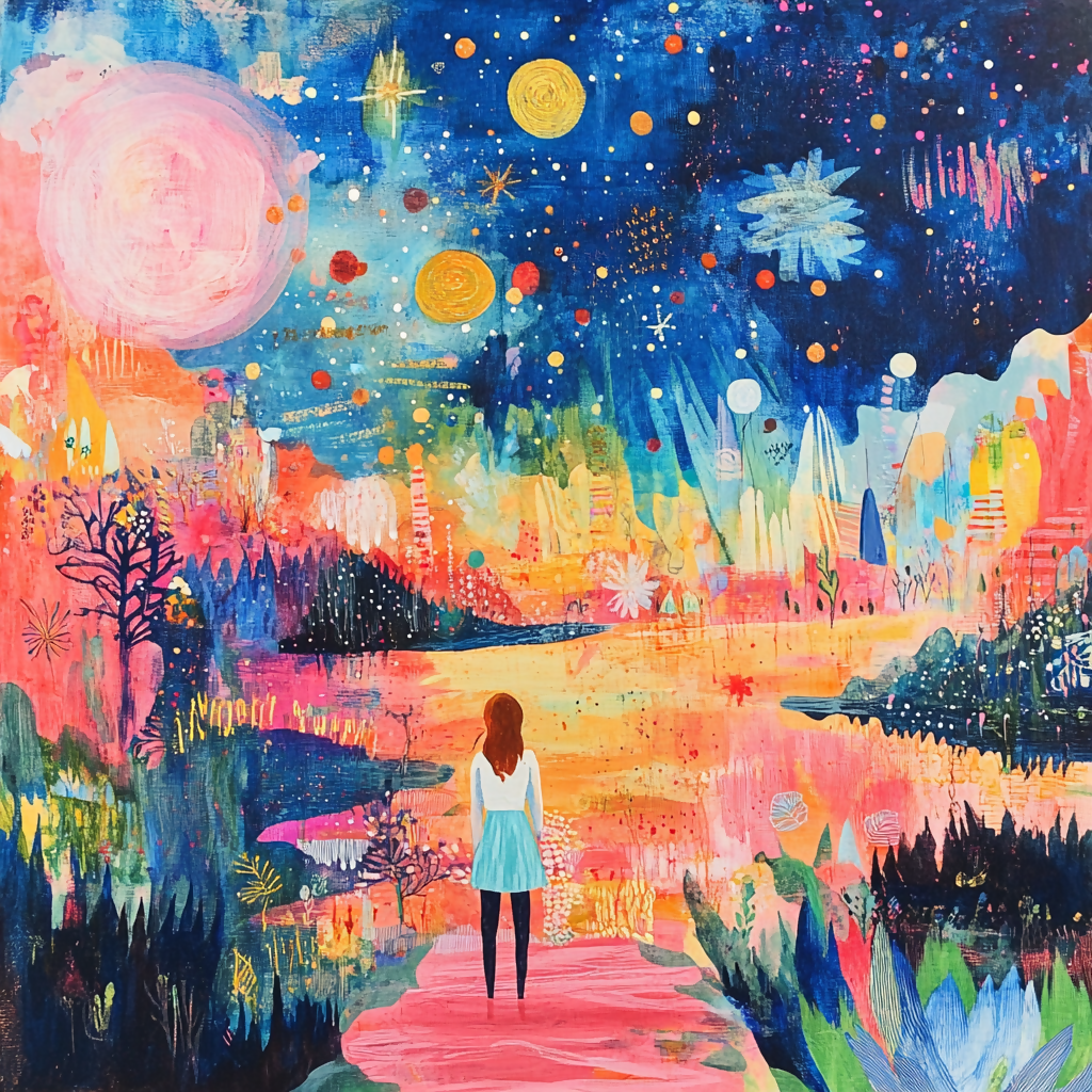 At the heart of the scene, a woman stands in quiet awe, gazing at a sky transformed into a breathtaking tapestry of abstract stars and planets. The celestial expanse above is alive with swirling patterns of vivid colors—ethereal blues, radiant purples, fiery oranges, and shimmering golds—all blending together in dreamlike harmony. Stars burst into unique, artistic shapes, and planets seem to ripple with energy, their surfaces adorned with abstract textures. The woman, silhouetted against this cosmic masterpiece, becomes a symbol of human curiosity and inspiration, standing at the edge of possibility and marveling at the boundless creativity of the universe.