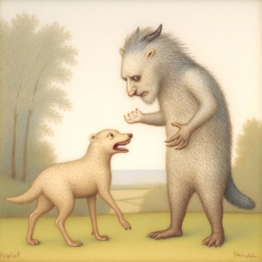 This canine companion is rendered in a light brown hue . Its mouth is open, suggesting an attempt to bark or perhaps even communicate, as it looks up at the larger entity. The dynamic between the two creatures hints at a narrative, a moment of encounter or dialogue.