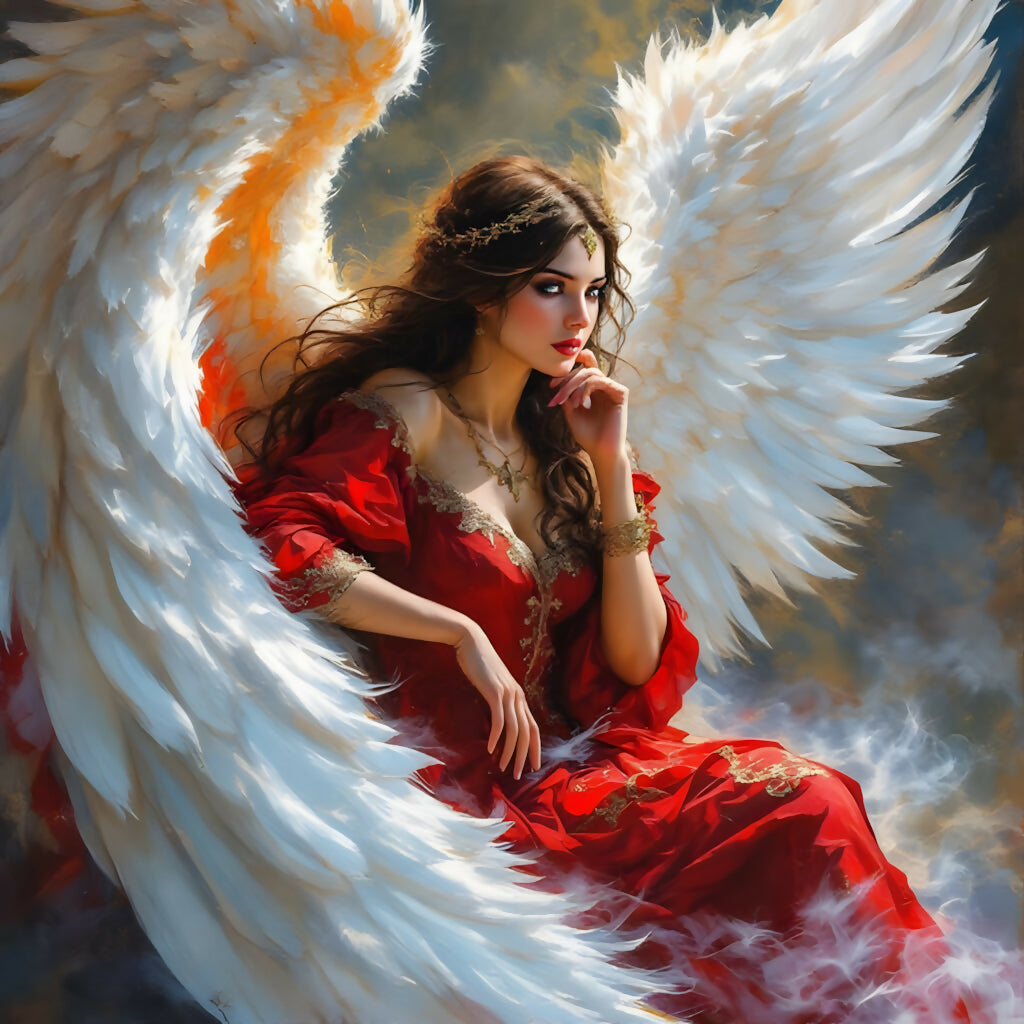 Draped in scarlet and gold, this celestial beauty rules the heavens with fire in her heart and strength in her gaze. Her pure white wings rise like thunderclouds, contrasting her passionate crimson dress adorned with gold embroidery. She is the embodiment of divine power wrapped in royal femininity.