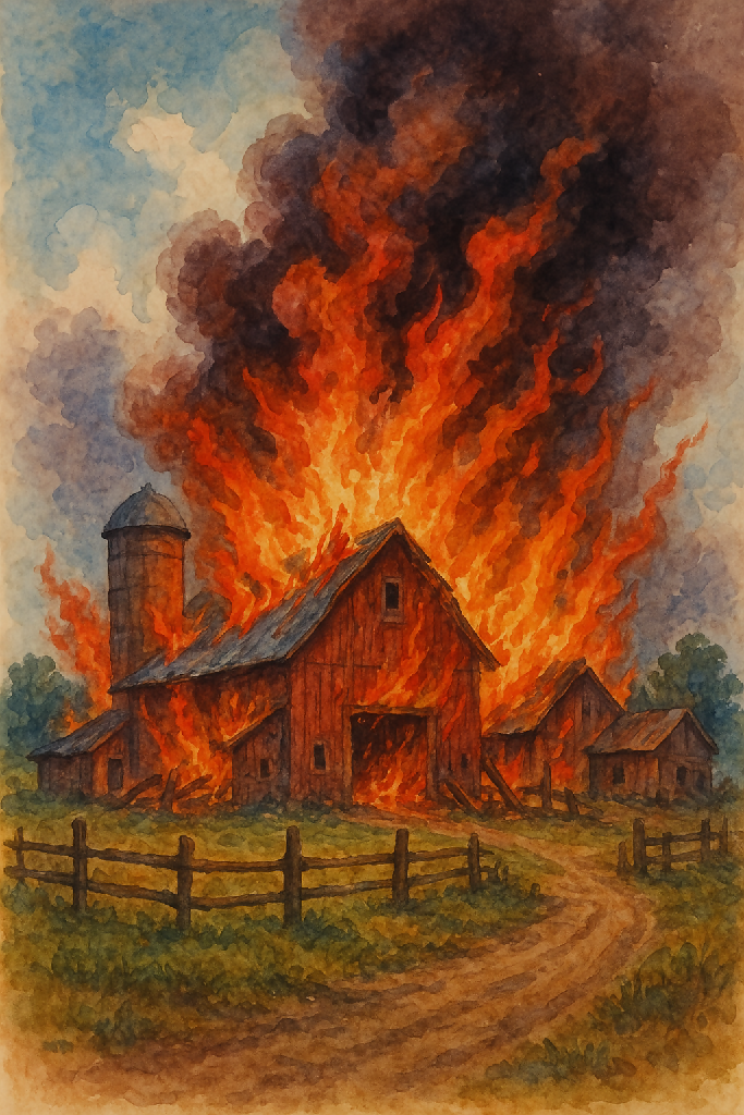 "In deep Bordeaux etched upon soft beige, the farm burns with quiet ferocity. Flames twist into engravings of memory, where structure and smoke dissolve into raw emotion—an image of loss rendered in stark, timeless gravure."
