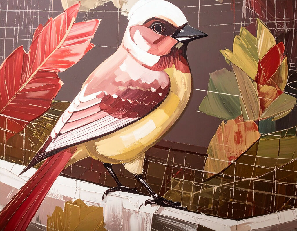 Crimson Perch" is a captivating AI-generated painting that blends realism with modern abstraction. At the heart of the composition is a vibrantly detailed bird perched confidently on a ledge, its feathers painted in rich hues of crimson, rose, and soft yellow. The background features an artistic mosaic of stylized autumn leaves in bold reds, olives, and ochres, layered with scratch-like textures and geometric grid lines — adding movement and modern flair.