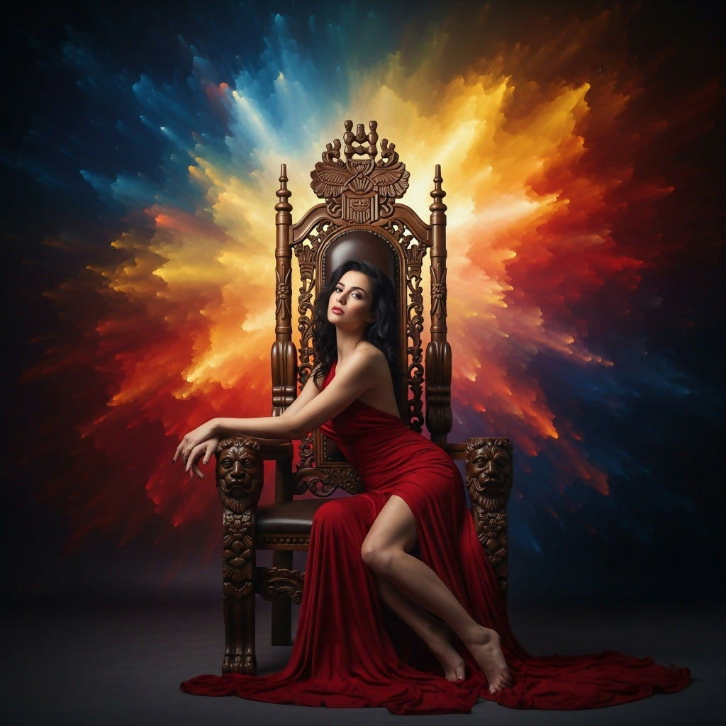 A regal woman in a flowing red gown sits confidently on an ornate throne against a vibrant, explosive backdrop of cosmic colors.