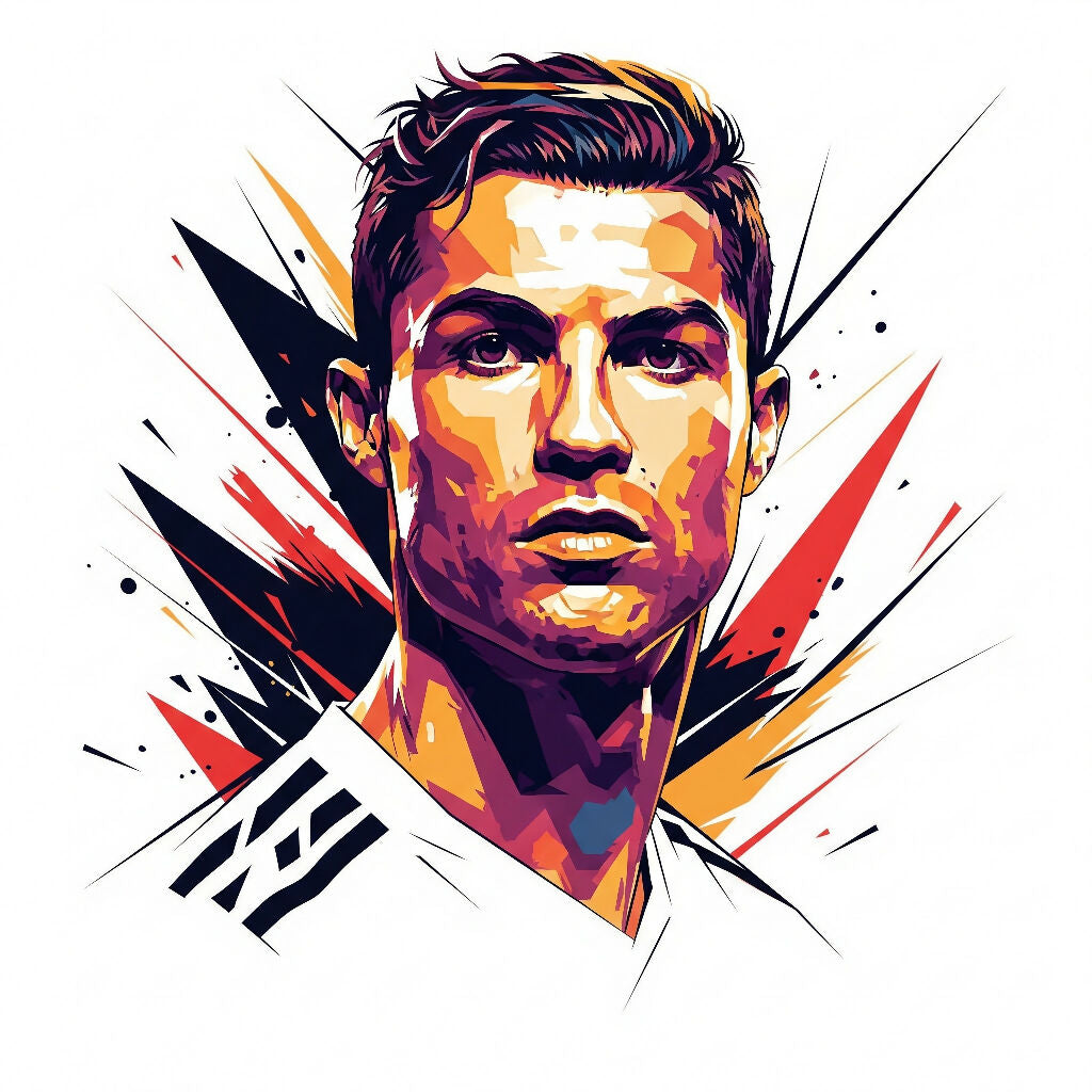 This is a vibrant, stylized digital art portrait of Cristiano Ronaldo. The image uses a pop art aesthetic with sharp, angular lines and a bold color palette of yellows, oranges, reds, and purples against a white background. Behind his head, there are dynamic, abstract shapes resembling shattered glass or explosive energy, adding to the energetic feel of the artwork. He is depicted from the shoulders up, wearing a white sports jersey with black stripes on the collar, typical of athletic wear.
