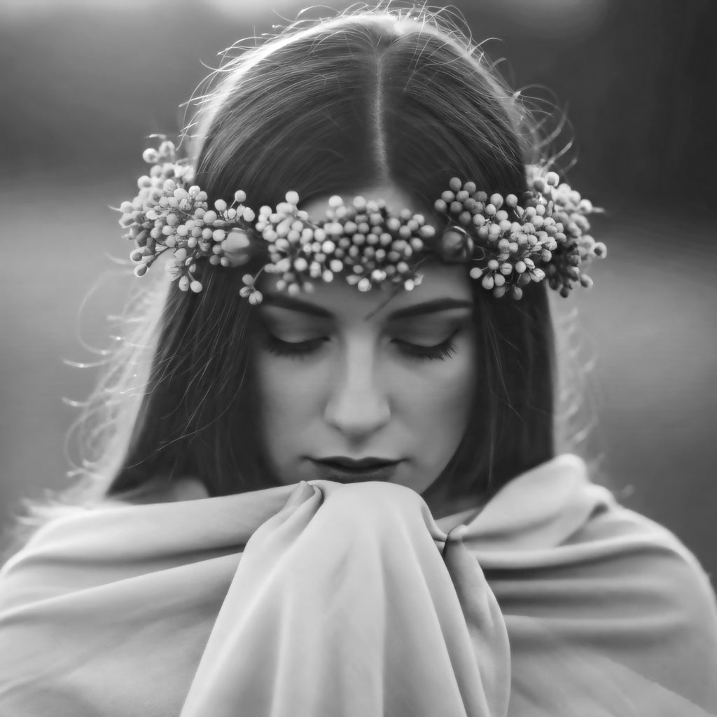 Gentle and melancholic black and white portrait of a woman wearing a delicate floral crown, wrapped in a soft, draped shawl.