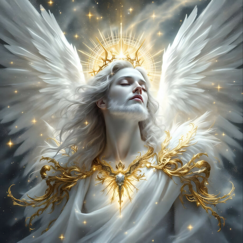 “Crown of Light” captures a regal, ethereal angel with flowing white hair, noble beard, and a glowing golden crown of radiance. His eyes are closed in peace, bathed in divine light and surrounded by a constellation of stars. Gilded armor and a heart-centered burst of golden energy illuminate his chest, representing purity, wisdom, and celestial authority.