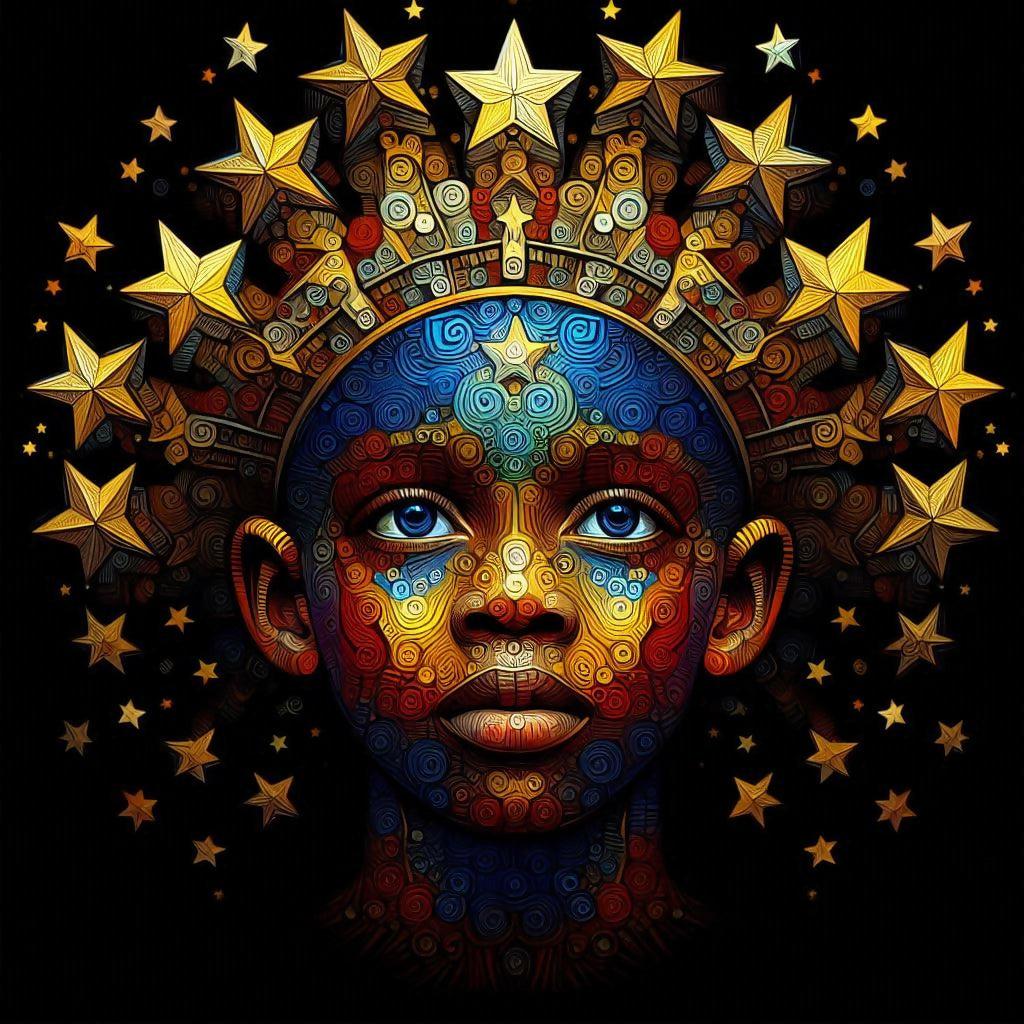 Celebrate the spirit of African unity with Crowned Legacy, a powerful portrait that radiates hope and pride. This evocative artwork features a boy adorned with a glowing crown of stars, symbolizing the strength, resilience, and unity of Africa. The intricate detailing captures the boy’s contemplative expression, reflecting both the challenges and dreams of a brighter future.