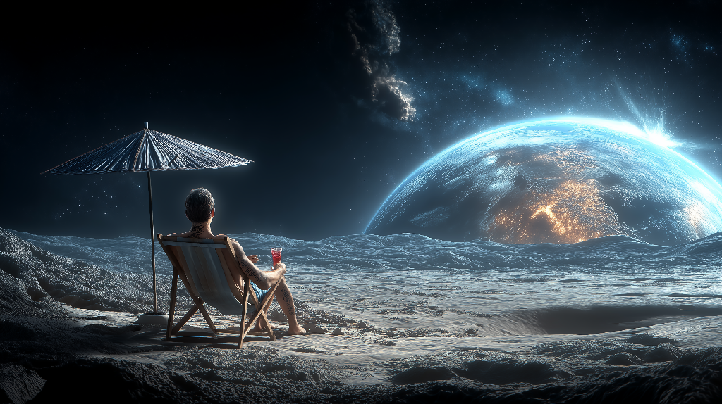 A man sits on the moon in space, wearing nothing but swim shorts, staring at earth and having a drink while the earth is being destroyed by a comet.