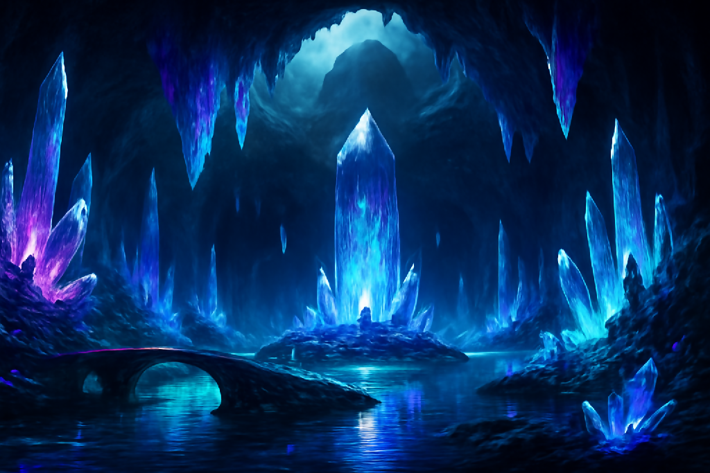 Step into a breathtaking subterranean wonder with this ultra-detailed artwork of a glowing crystal cavern. Massive blue and violet crystal formations rise from the cavern floor and ceiling, reflecting across a tranquil river. At the heart of the scene, a radiant crystal obelisk pulses with mystical energy, creating an atmosphere that is both enchanting and otherworldly. Perfect for fantasy lovers, gamers, and art collectors, this piece transforms any room into a gateway to another realm.