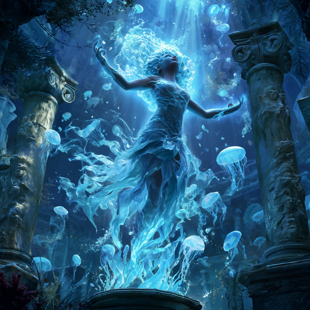 A translucent siren with glowing veins rises above a shattered marble column, her hair swirling like liquid glass as she summons the forgotten city beneath the sea. Bioluminescent fish spiral around her in radiant currents, and colossal jellyfish pulse like living lanterns. Coral-covered arches tremble, ancient statues stir awake, and strands of seaweed twist upward like enchanted ribbons. Silver moonlight pierces the depths, illuminating a scene full of magic, motion, and mystery.