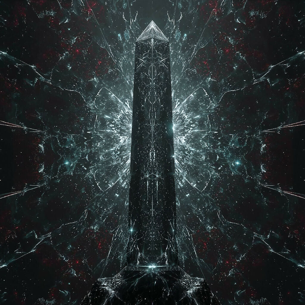 Crystalline formations create perfect bilateral symmetry around a central spire, suggesting sacred geometry and dimensional gateways. The composition's mirror-like balance evokes cosmic order and universal principles. Sharp, prismatic elements pierce through darkness, representing divine illumination breaking through material reality's veils.