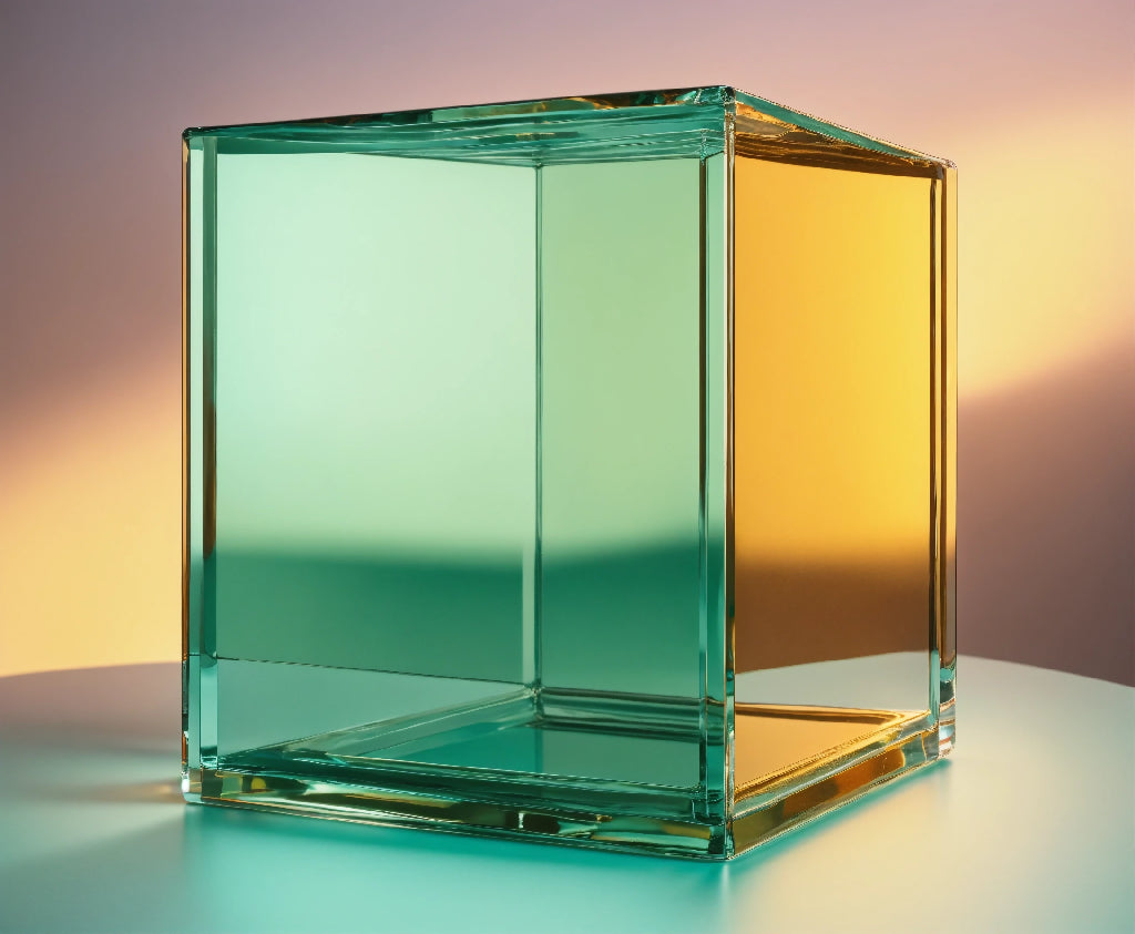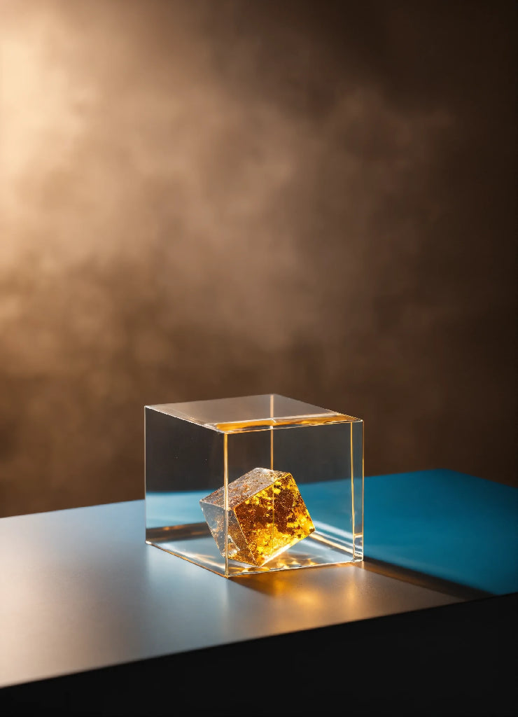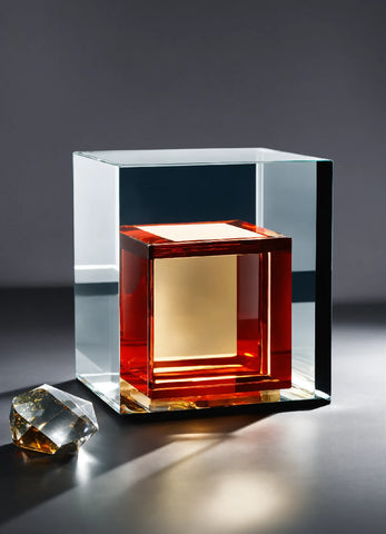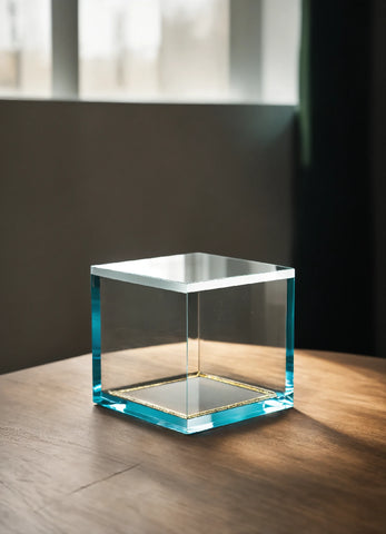 This high-resolution 4K studio photograph features a clear glass cube placed on a tabletop. Inside the cube is a carefully arranged object, showcasing intricate details through the transparent glass. The neutral background complements the subject, emphasizing the clarity and form of both the cube and the object within. The lighting is soft and balanced, highlighting the smooth surface of the glass and creating a sophisticated, clean visual aesthetic. This minimalist composition captures the essence of modern design and precision in product photography.