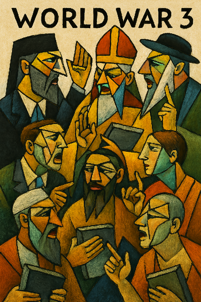 The portrait channels Picasso’s fragmented geometry and emotional intensity to depict religious figures locked in a heated debate. Each holds a sacred book, their faces contorted in angular expressions of conviction, frustration, and defiance. The color palette is electric: reds, blues, yellows, and greens clash across the canvas, echoing the ideological tension.