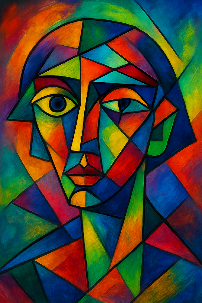 A vibrant cubist-inspired abstract portrait featuring fragmented geometric shapes, bold outlines, and vivid contrasting colors. The artwork captures a dreamlike atmosphere, blending surrealism with modern cubism, making it perfect for contemporary wall art or gallery displays.