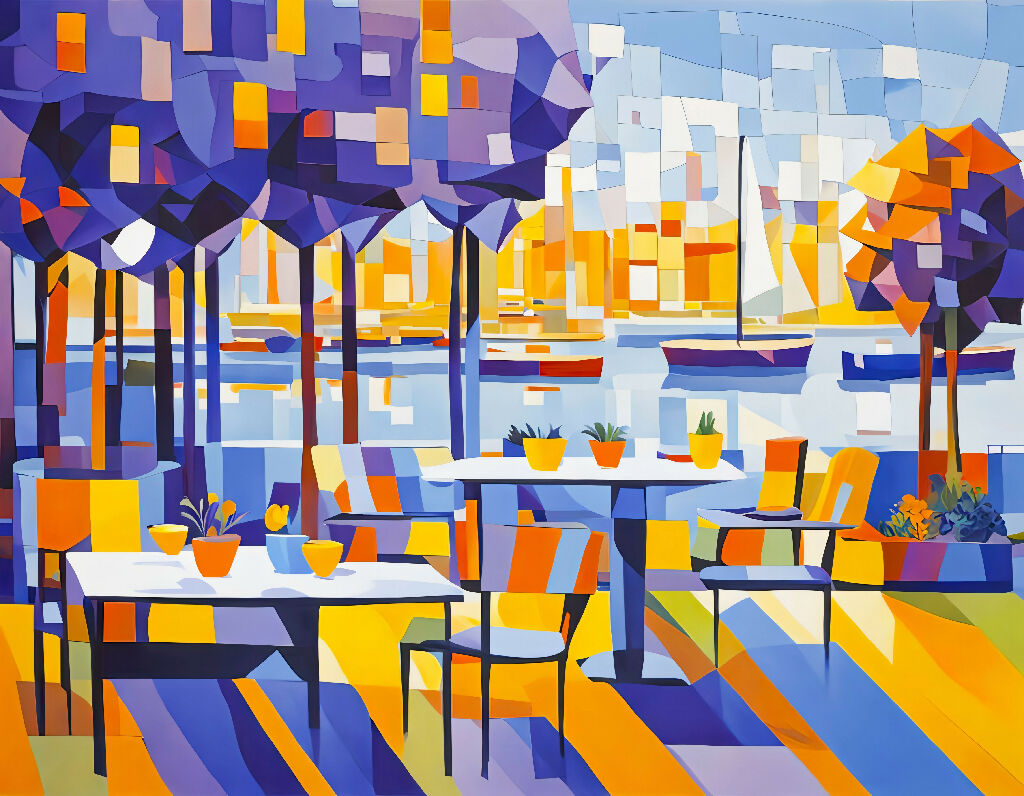 A charming cubist painting of an outdoor café with colorful tables and chairs under purple trees. The geometric patterns enhance the cozy urban setting.