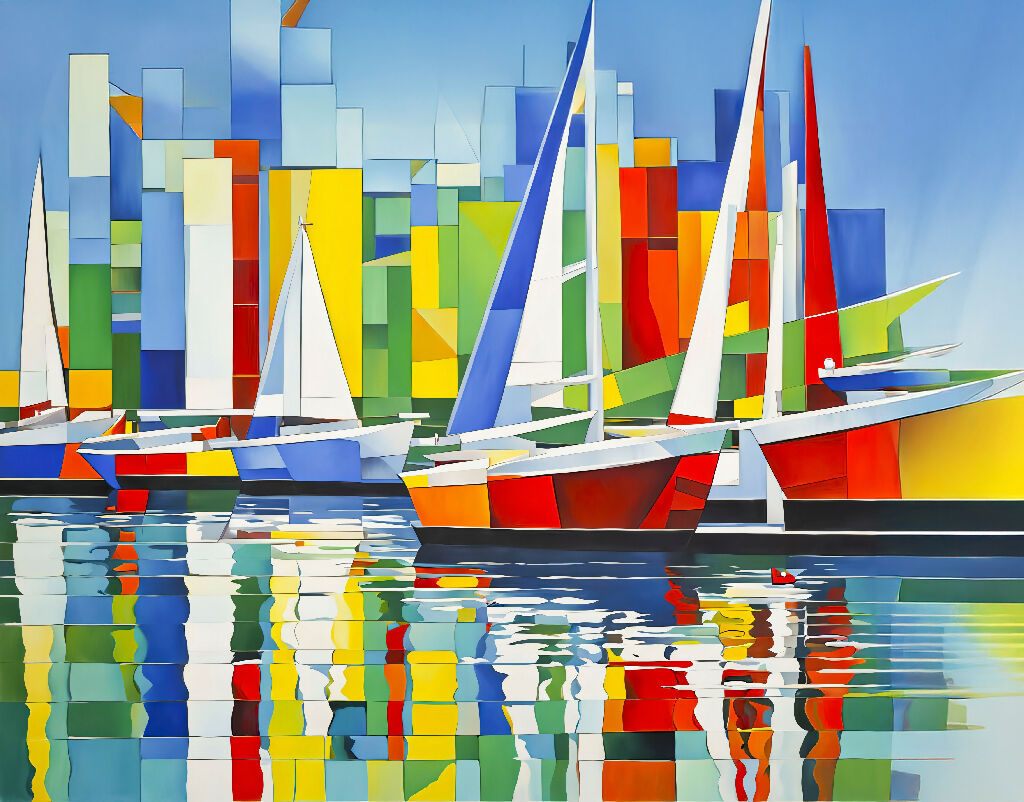 cubist painting of colorful sailboats docked in a harbor. Bold geometric patterns and bright reflections create a lively maritime atmosphere.