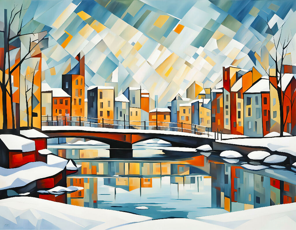 A winter cubist cityscape featuring snowy buildings and arched canal bridges. Reflections on icy water and geometric details add depth and contrast.