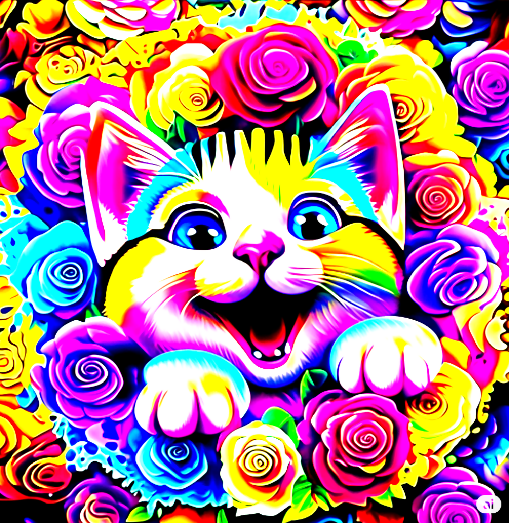 This vibrant and whimsical image captures a joyful kitten surrounded by a radiant explosion of multicolored roses. The playful expression on the kitten's face, with its wide eyes and cheerful smile, adds a heartwarming charm to the scene. The neon colors and bold contrasts give the artwork a dreamlike, psychedelic quality, celebrating the innocence and happiness that animals bring into our lives. Perfect for lovers of cats, colors, and all things bright and cheerful.