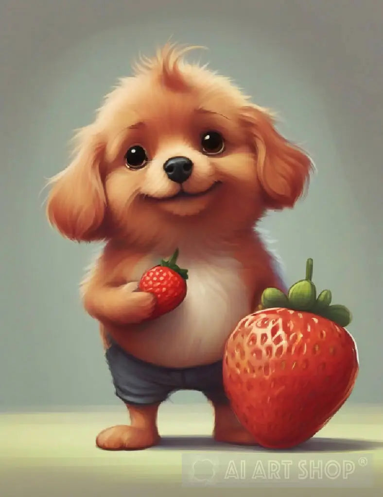 A cartoon drawing of a pet holding a large strawberry compared to its small size