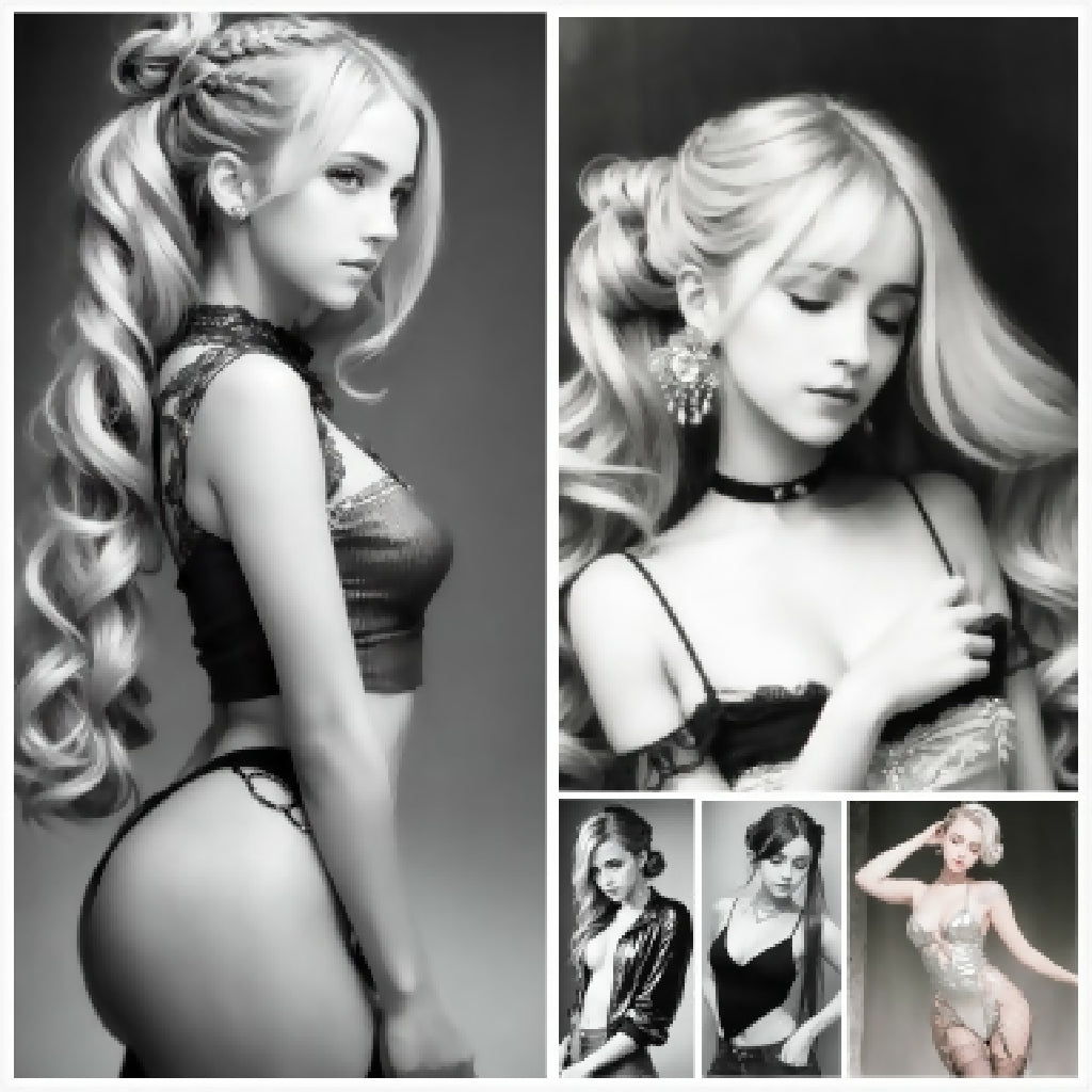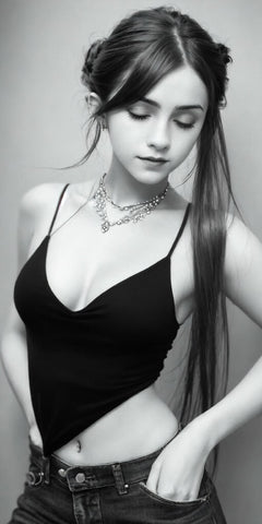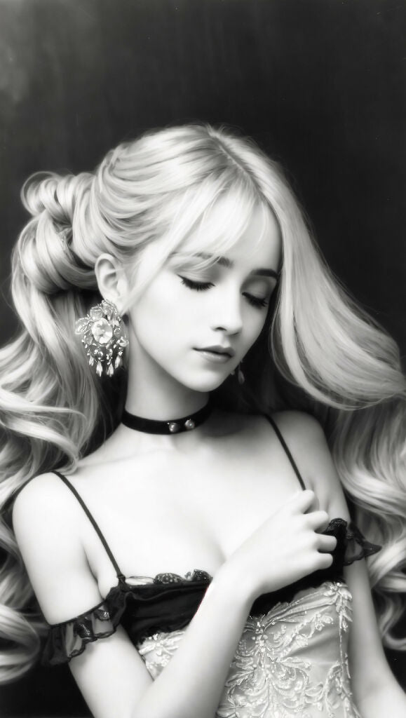 These 5 captivating black-and-white portraits capture the serene beauty of a young woman in a moment of quiet reflection. Her delicate features, closed eyes, and gentle expression evoke a sense of timeless grace, while the intricate details of her hairstyle, adorned with delicate ornaments, add a touch of regal sophistication. The soft interplay of light and shadow enhances the image's depth, creating a striking contrast that draws the viewer in.