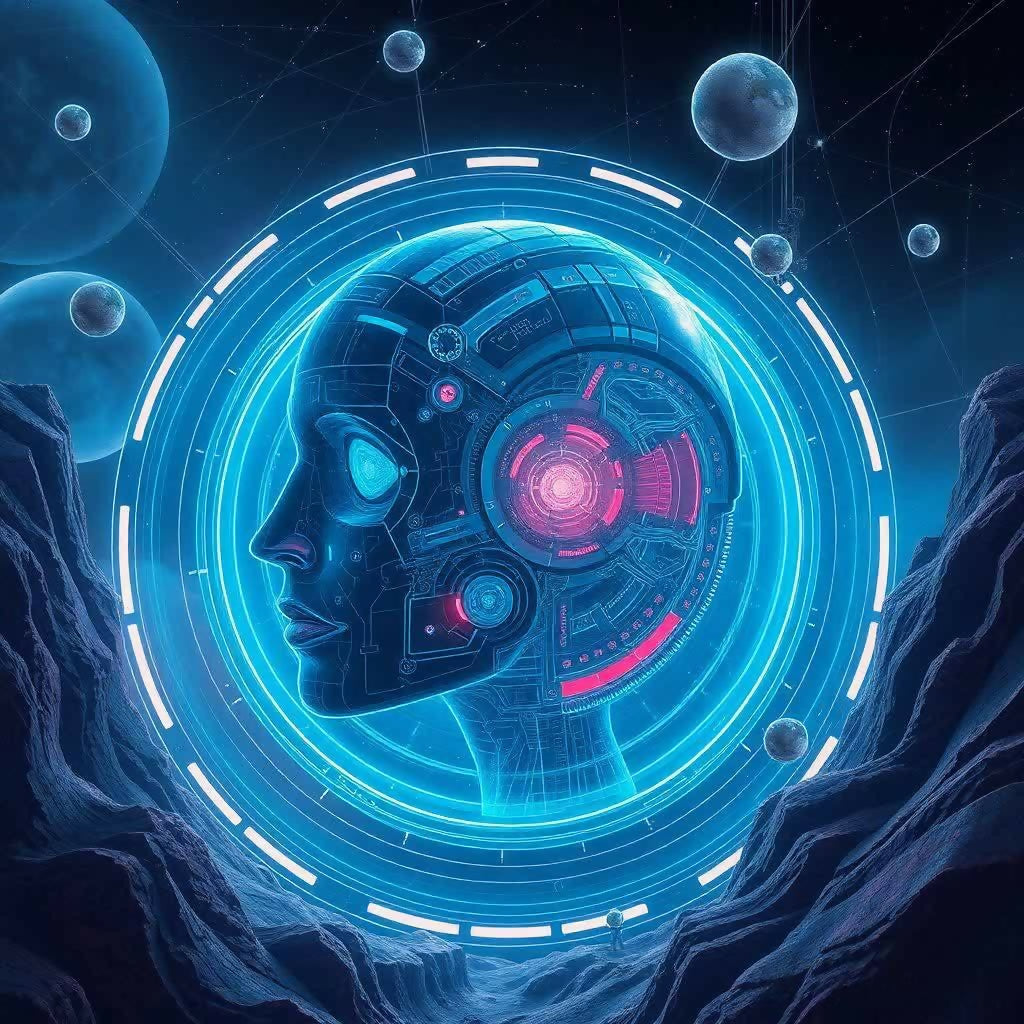 This image depicts a futuristic, cybernetic head surrounded by glowing blue circuitry and digital rings, set against a cosmic background filled with planets and stars. The scene combines elements of advanced technology and outer space, symbolizing the fusion of artificial intelligence and the mysteries of the universe. Rugged terrain in the foreground contrasts with the sleek, illuminated digital elements, creating a striking visual of technological evolution amidst the vastness of space.