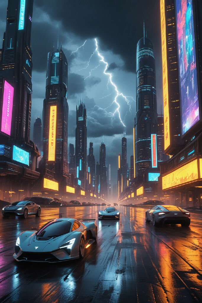 "A futuristic cyberpunk city at night, drenched in neon lights, with flying cars, towering skyscrapers, digital billboards, and rain-slicked streets, cinematic lighting, ultra-detailed"